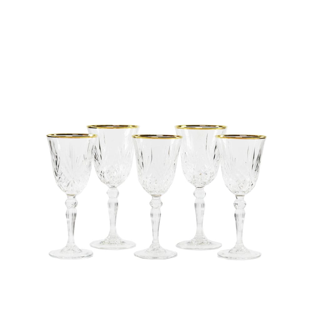 Description: Beautiful gold rimmed water. red and white wine glasses.